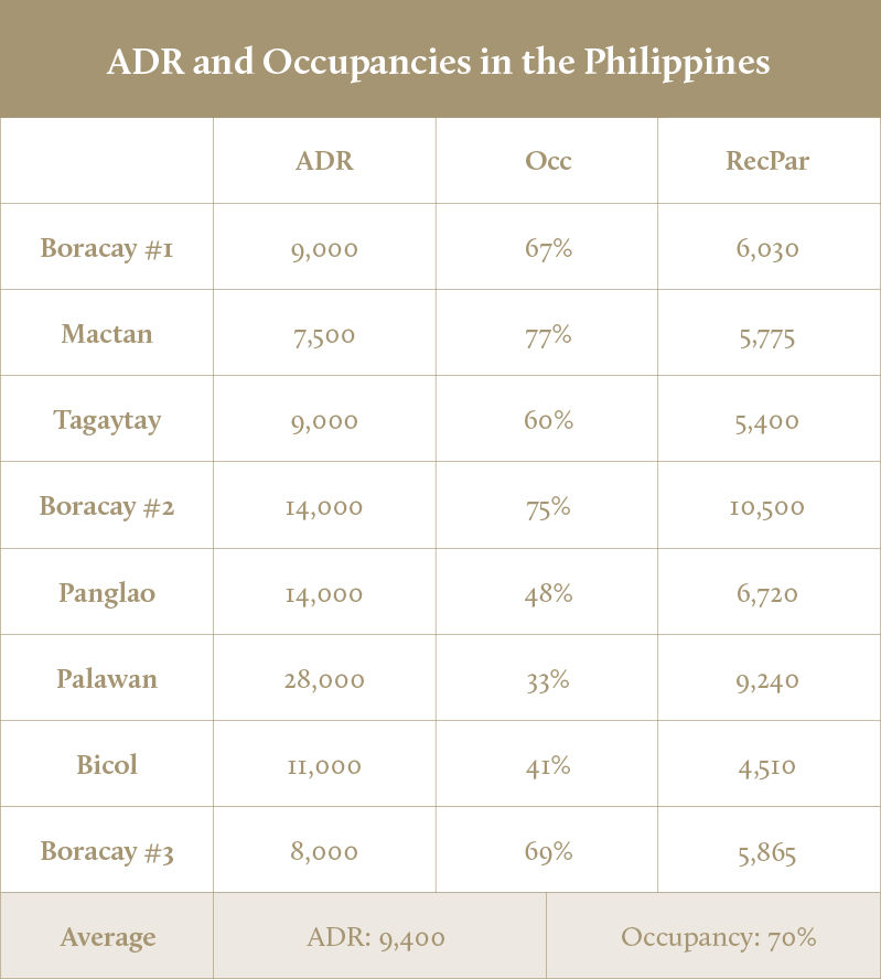 The Philippines is emerging as not only an economic force, but also as a top tourist destination. The luxury hotel sector is performing at above average levels because the supply is well below the demand. Below are the only international standard luxury hotels in the country and their respective performances. Any other major tourist destination around the world has many more rooms.